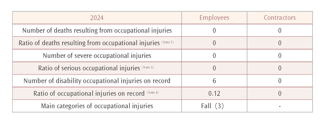 1. This table has been computed in compliance with the Occupational Safety and Health Act, the definition of occupational disasters, and the indicators released by the Global Reporting Initiative (GRI).