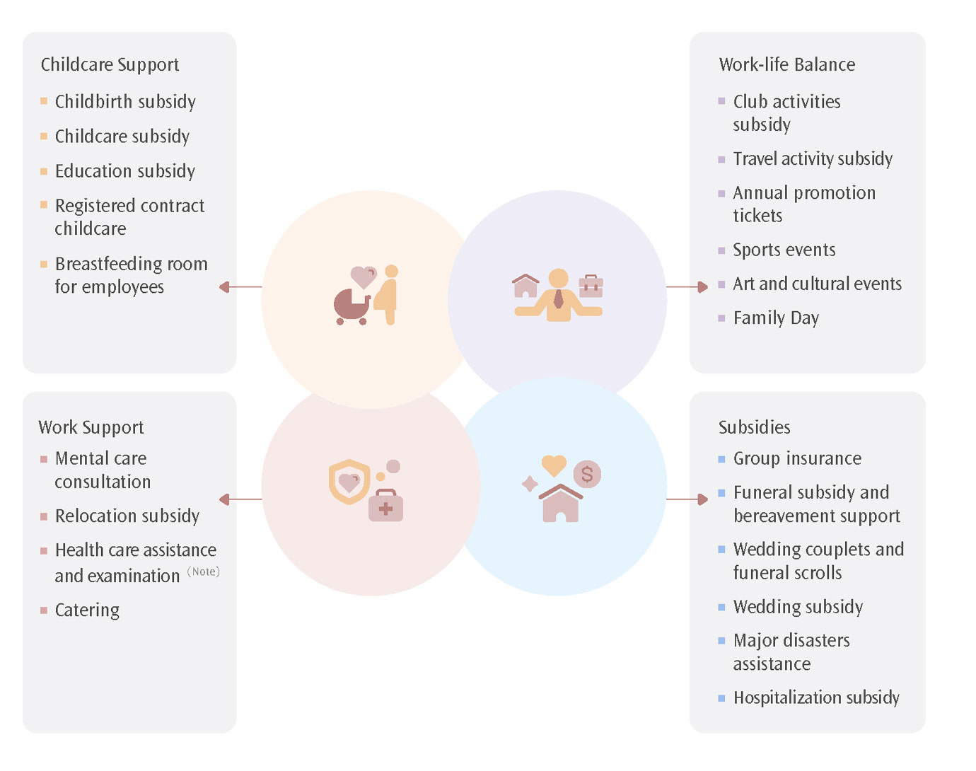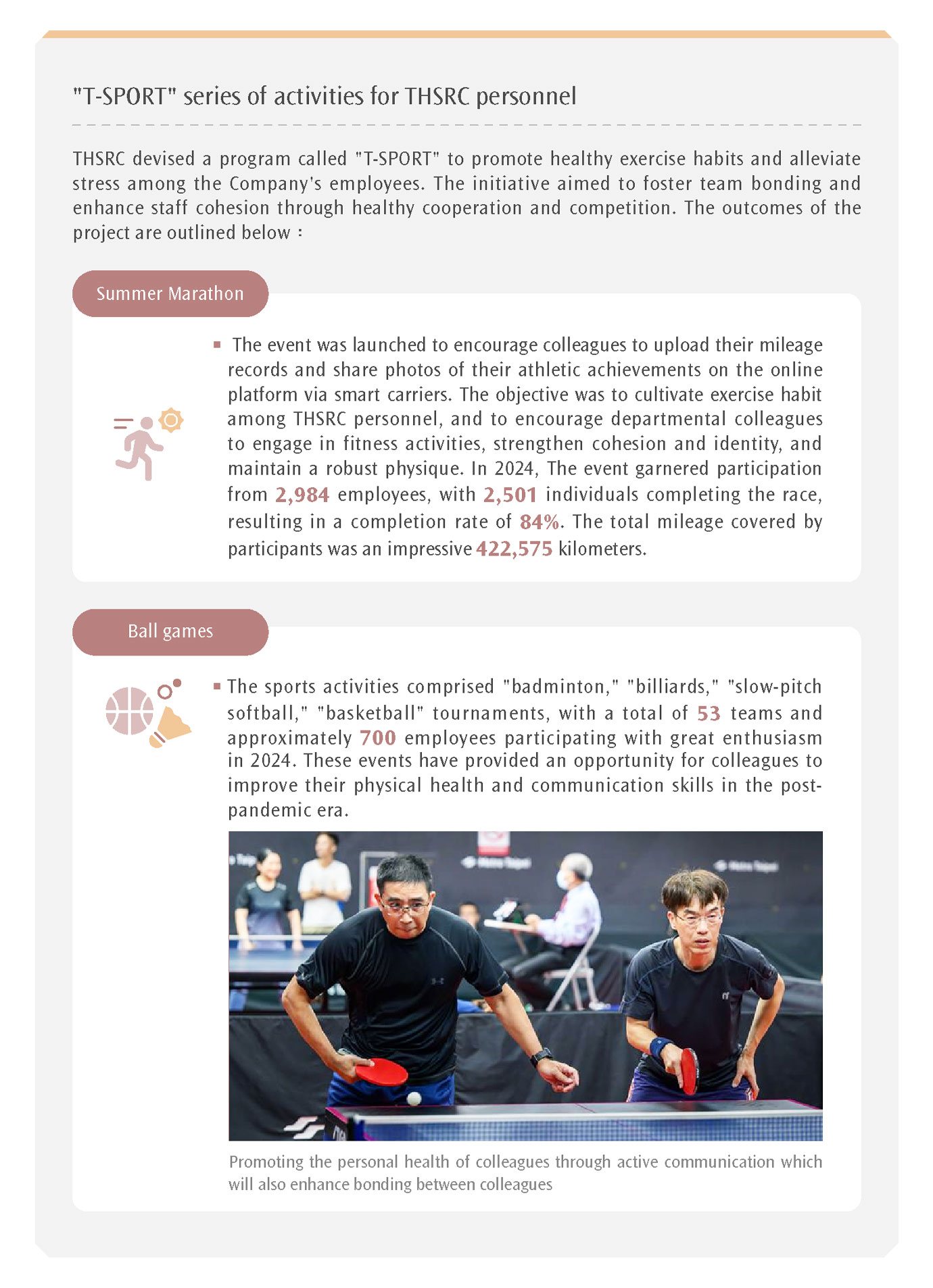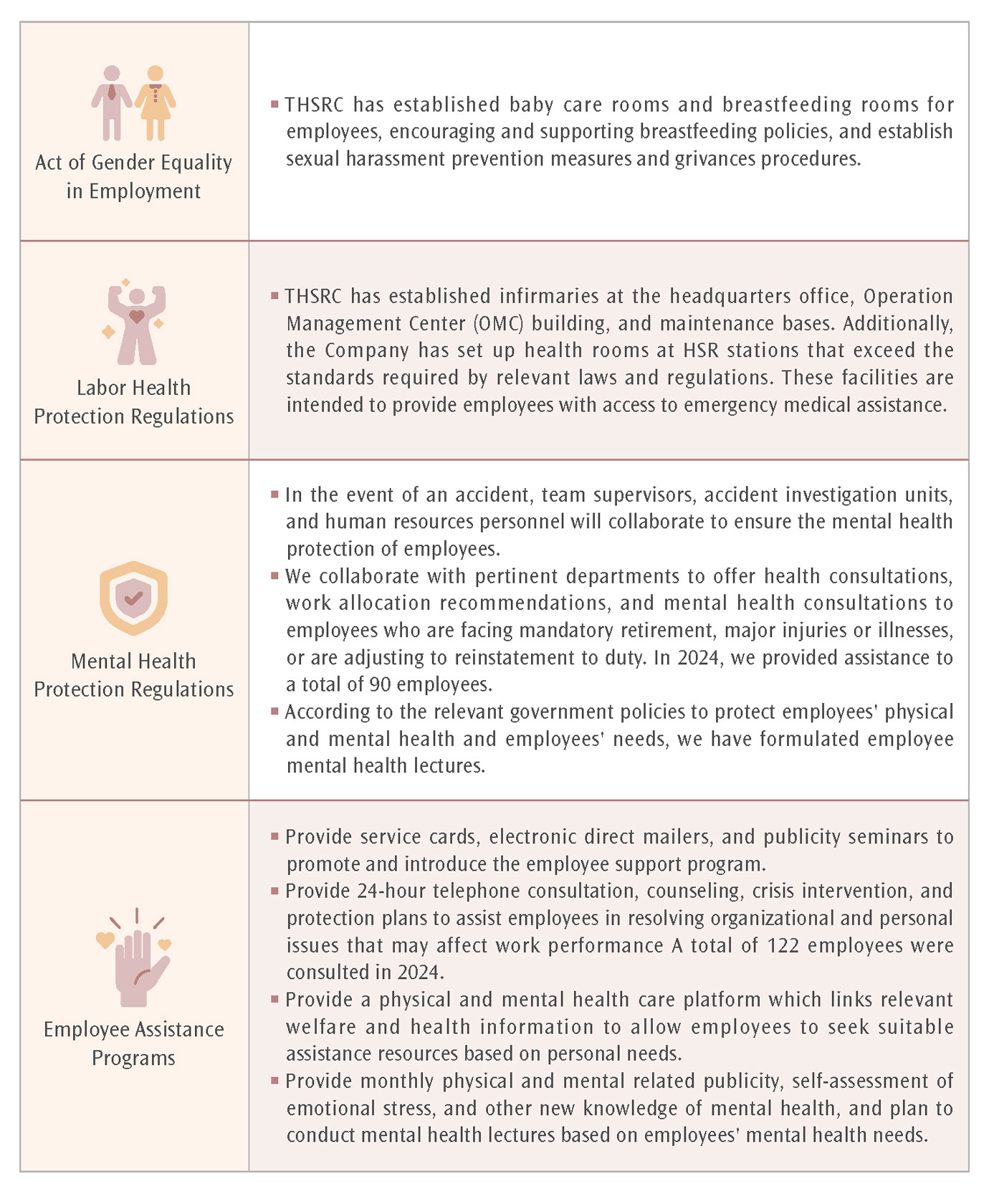 THSRC has implemented internal care measures in compliance with the “Act of Gender Equality in Employment” and “Labor Health Protection Regulations” to ensure employee well-being. Additionally, the Company has established the “Mental Health Protection Regulation” to cater to the diverse needs of its employees. THSRC continuously introduced an external “employee assistance program, EAP” to create a more employee-friendly work environment. This program aims to assist employees in addressing various issues, provide timely support and assistance, and maintain their physical and mental health. Further details are as follows: