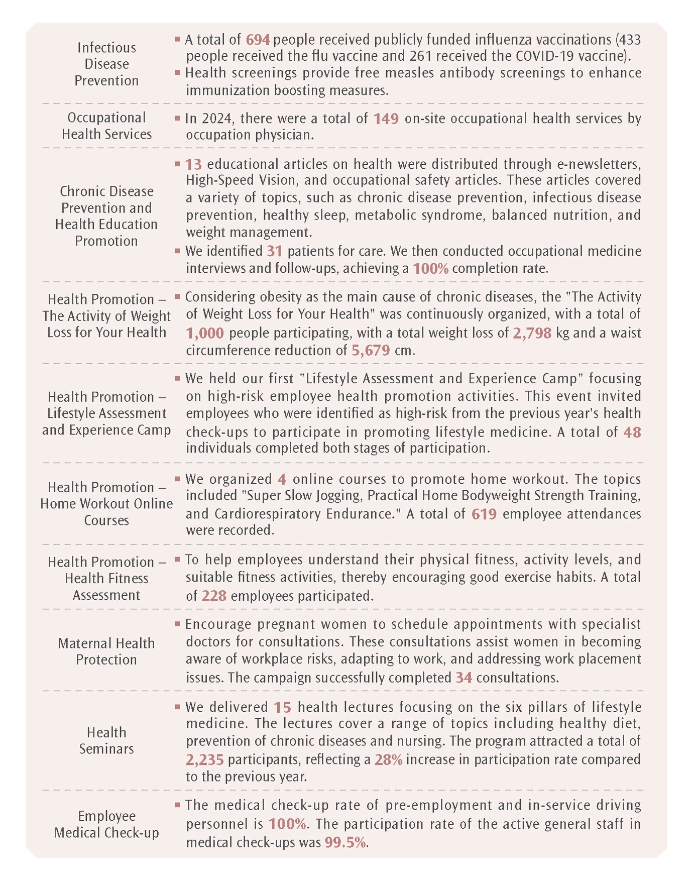 Note: THSRC's health examination measures are superior to those stipulated in the relevant laws and regulations, where general employees aged 45 years old and above undergo health examination once a year, and those aged under 45 years old undergo health examination once every two years, while train personnel undergo health examination once a year. The 2024 annual health examination for general and train personnel was completed from March to August, and 100% of train personnel completed the health examination.