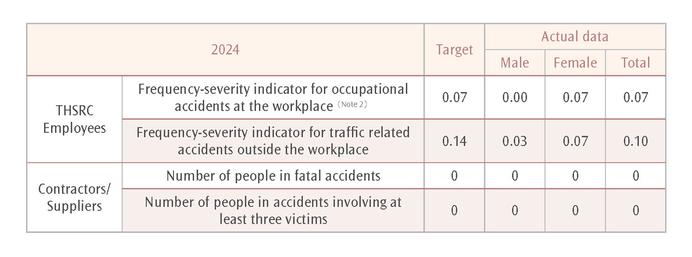 THSRC has established measurable and trackable indicators for evaluation,supported with periodic and non-periodic inspections and audits. The table below outlines the achievement of our occupational safety and health management goals for THSRC employees, contractors, and suppliers, as well as our occupational safety indicators for 2024.