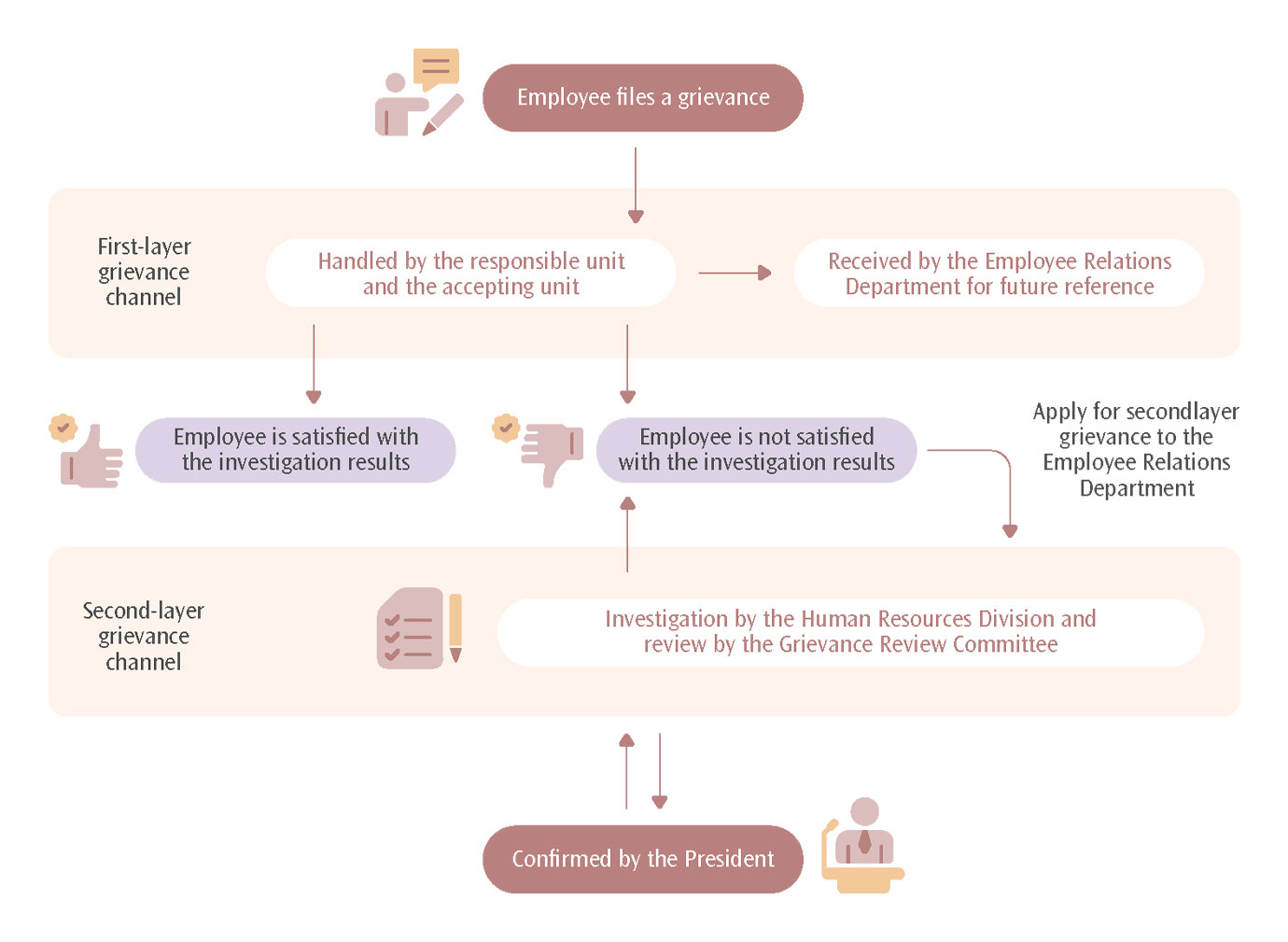 The chart below illustrates the procedure for addressing employee grievances at THSRC. In 2024, a total of 7 complaints were filed, primarily concerning interpersonal and management matters. All cases were resolved in accordance with the established employee complaint process, and all responses and cases were concluded. THSRC endeavors to enhance awareness of the process through trade union and labor-management conferences. Going forward, THSRC will remain committed to proactively addressing employee complaints to foster harmonious labor-management relations and cultivate a transparent workplace environment.
