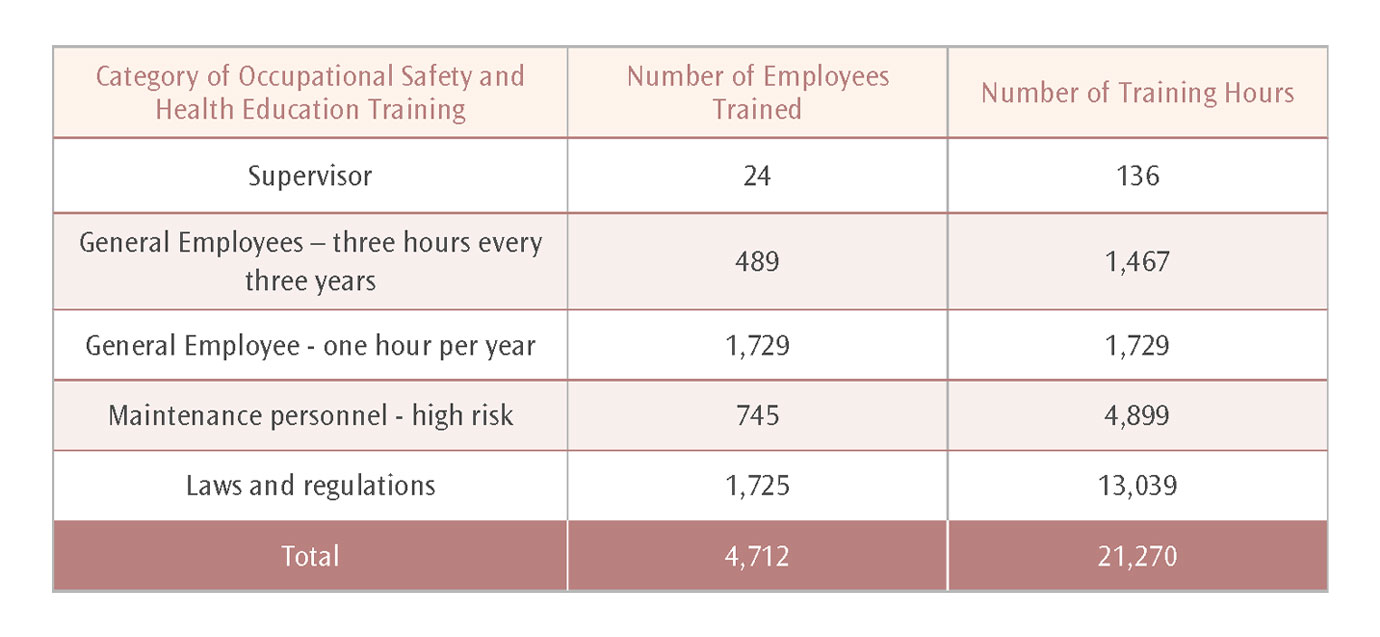 In order to cultivate and internalize the occupational safety and health culture,THSRC continuously implements various occupational safety and health training for new comer and in-service personnel by categorized employees into for supervisors, general employee and maintenance personnel. In addition, for colleagues engaged in high-risk operations, training including production machinery, mobile elevating work platforms, hoists, construction, hypoxia operations, electric welding, and chemical use and disposal were provided as to strengthen our employees' emergency response capabilities. In 2024, a total of 4,712 employees completed these training sessions, totaling 21,270 hours. Please refer to the following table for detailed training information: