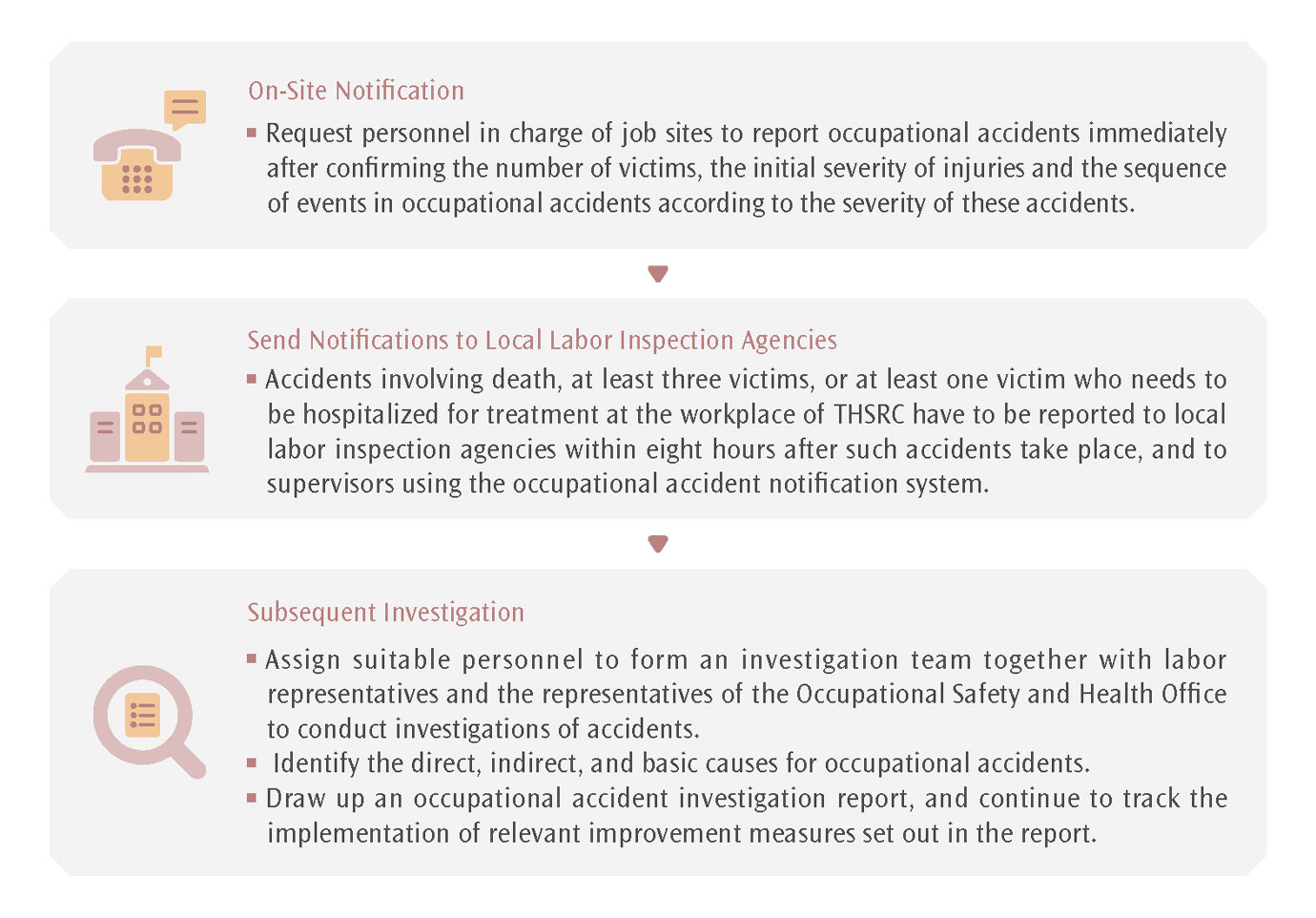 If a worker discovers that there is a risk of immediate harm when performing his/her duties, the “Occupational Safety and Health Act” shall prevail in priority, and the worker can stop the operation and retreat to a safe place.The immediate supervisor who is informed will initiate subsequent measures to eliminate hazardous situations to ensure the safety of workers. In case of a disaster, after the internal and local competent authorities are informed, THSRC will immediately initiate an investigation process as per the “Occupational Accident Notification and Investigation Process,” with the aim of handling the incident effectively and alleviating the negative impact as quickly as possible. During the investigation, the immediate unit supervisor of said worker will lead the occupational accident investigation team to carry out the investigation jointly with labor representatives to ensure labor rights.