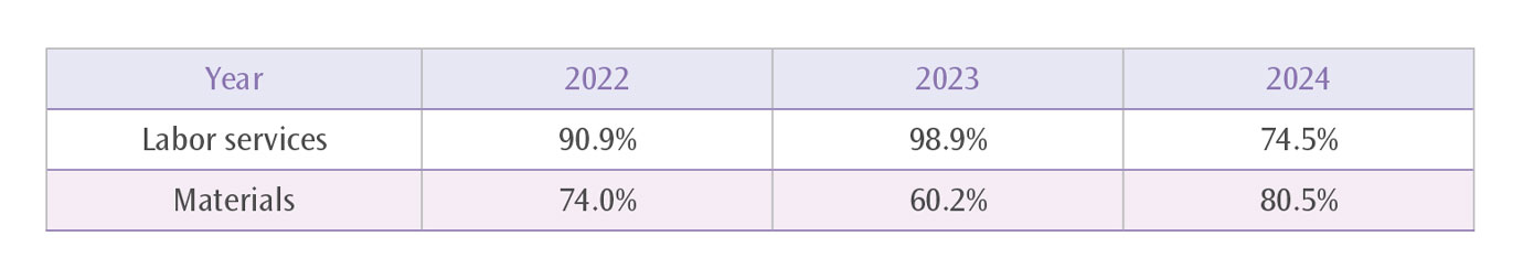 In 2024, the total amount of material purchases conducted by THSRC was approximately NT$3.3 billion, where the amount of procurement from local suppliers accounted for 80.5% of the total amount. Meanwhile, the amount of labor service procurement in 2024 exceeded NT$12.7 billion, of which 74.5% came from local service procurement. The figures as at below: