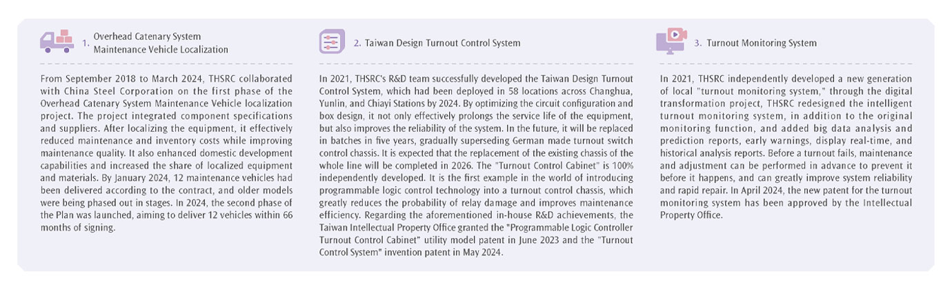 In its efforts to promote the growth of local rail technologies and capabilities, THSRC is committed to localizing the rail supply chain. Through collaborations with government research projects and universities, we are expanding our domestic supplier base and deepening the local supply chain for high-speed rail materials and components. In 2024, we successfully completed 104 alternative sourcing cases, after visiting a total of 250 local suppliers. Through joint work with 136 alternative materials-developing suppliers from 2011 to 2024, we were able to save approximately NT$4.1 billion. In addition to expanding our recruitment of manufacturers, THSRC has also broadened our cooperation with industry, government, academia, and research to jointly developed high-speed railway equipment and system innovation technology. Through these efforts, we have contributed to the localization of railway transportation and achieved our goal of "Localization of Domestic Vehicles." Relevant cooperation projects in 2024 include: