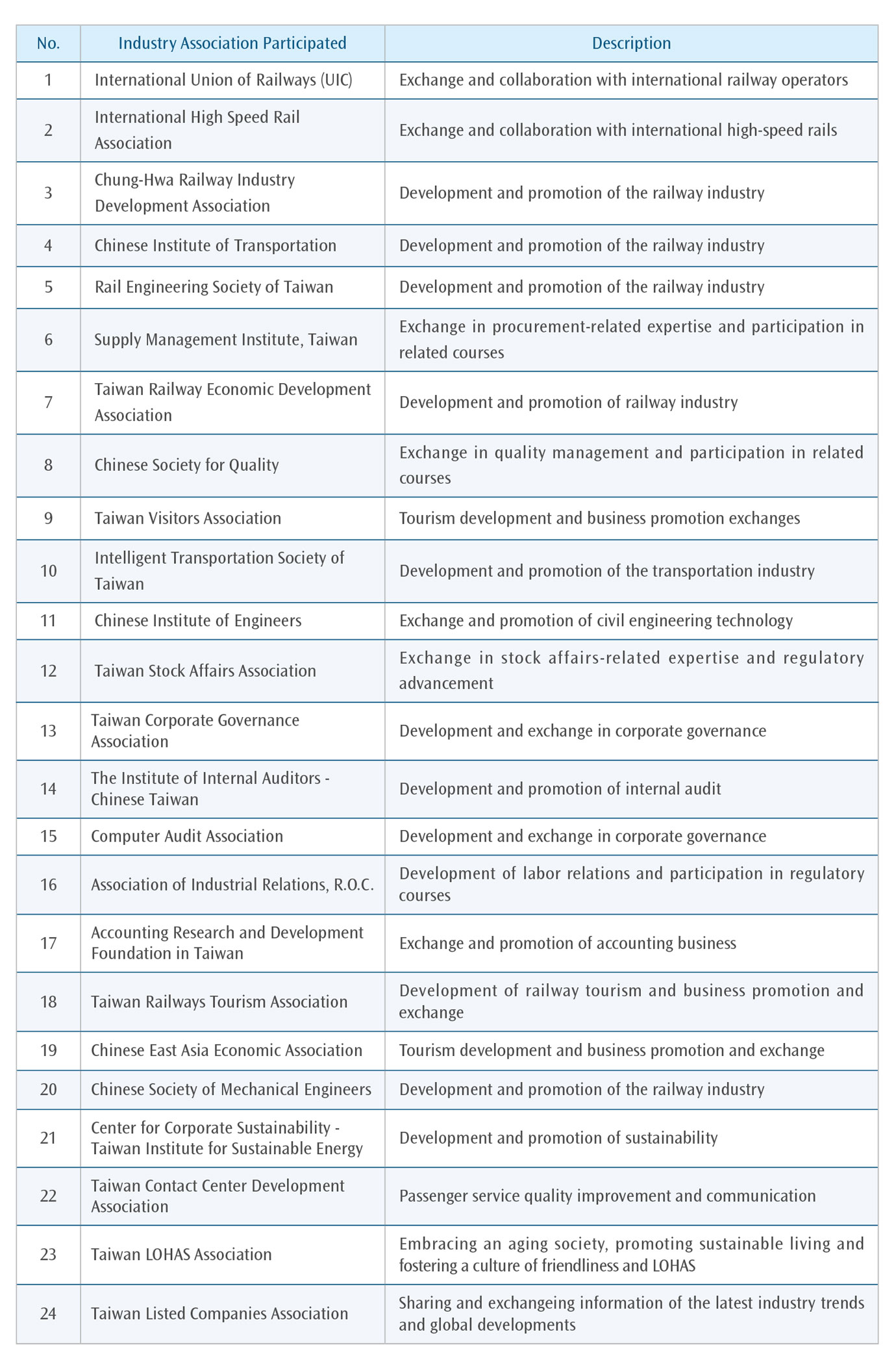 THSRC actively responds to international industry trends through technical visits, international observations and local industry-academia cooperation, and continues to improve rail industry technology. In 2024, THSRC participated in 24 public associations as a member, maintained close cooperation relationship with domestic and foreign transportation rail industries, and jointly promoted the development of Taiwan's rail industry. Through technical collaboration and experience sharing, we continuously enhance the professional knowledge and capabilities of personnel in operation control center, station service/train service, and vehicles, in order to deliver higher quality and more innovative services to our passengers.