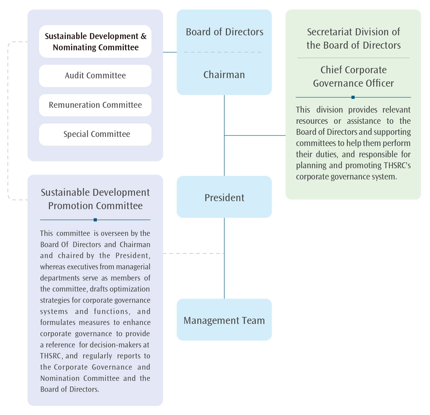 THSRC firmly believes that thought-out, transparent, and efficient corporate governance is the foundation for pursuing steady development, continuously improving operational safety and sustainable performance, and further creating sustainable value. The Company complies with domestic laws and regulations to establish the "Corporate Governance Guidelines," and has established the Board of Directors and various functional committees under it to optimize the overall governance effectiveness of the Company through various management mechanisms.