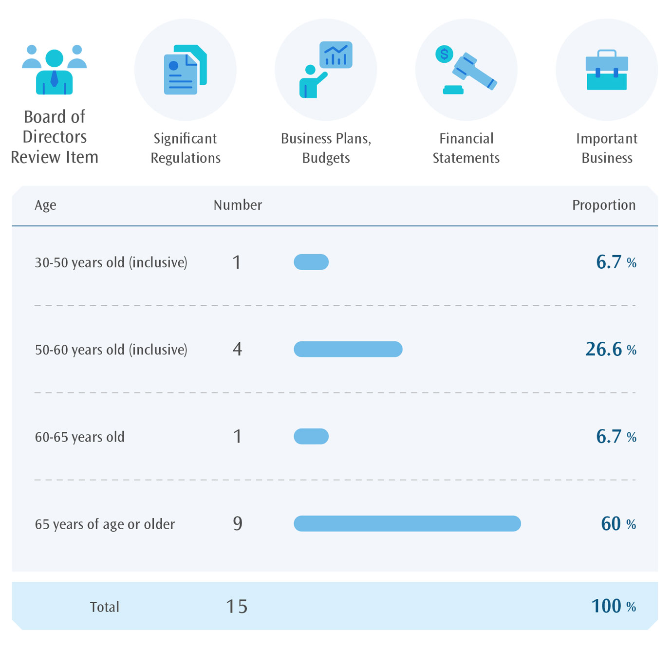 The Board of Directors serves as THSRC's highest governing body. Its main strength and responsibilities include the power conferred by relevant laws and regulations, and the shareholders' meeting, reviewing significant regulations, business plans, budgets, financial statements, and important business, as well as supervising management execution results and guiding the management team. As of January 2025, the Board of Directors has 15 directors(including 5 independent directors), with 80%(12)men and 20%(3)women, and we will strive to increase the proportion of female directors in the future to meet the norms of diversity in governance organizations. At present, the average age of the Board of Directors is 64.65 years old, including 6 doctors, 6 masters and 3 bachelors, all of whom have relevant professional backgrounds and relevant ESG experience required by the transportation industry. In terms of professional ability, the Board of Directors as a whole has the ability of marketing technology, business management, law, financial accounting, leadership decision-making, industrial knowledge, crisis management and international market view. Please refer to Appendix Table 2 for composition background on the members of the Board. The age distribution of the Board is as follows: