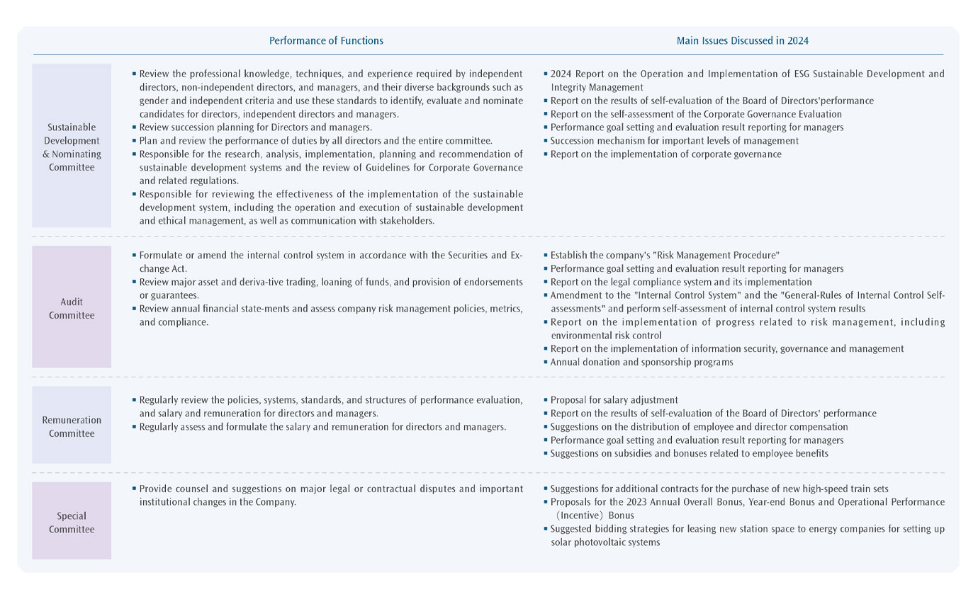 In order to effectively perform the competencies of the Board of Directors and elevate the caliber of its decisions, functional committees have been set up under THSRC's Board of Directors, including the "Sustainable Development & Nominating Committee," "Audit Committee," "Remuneration Committee" and "Special Committee." These Committees aid the Board of Directors in fulfilling its supervisory and advisory duties, deliberating pertinent matters, and presenting conclusions and recommendations to the Board of Directors for resolution. Please refer to the table below for the description of each functional committee's responsibilities and the issues discussed in 2024. For further information on operations, please refer to "Operation Status of Functional Committees."
