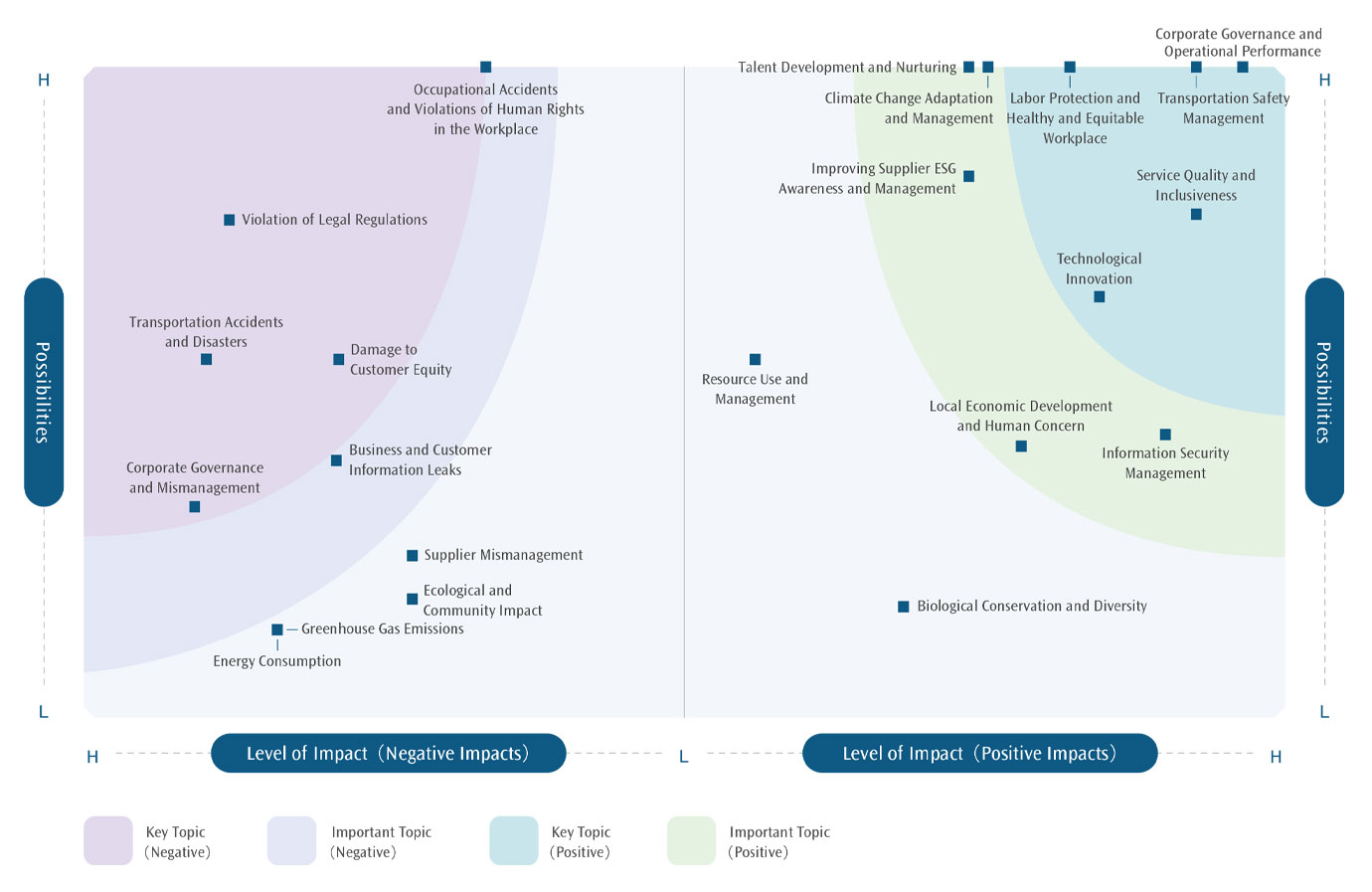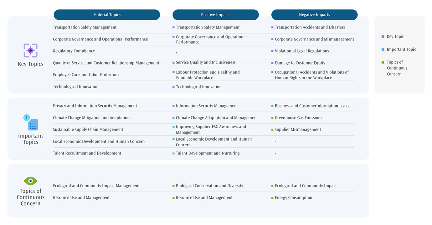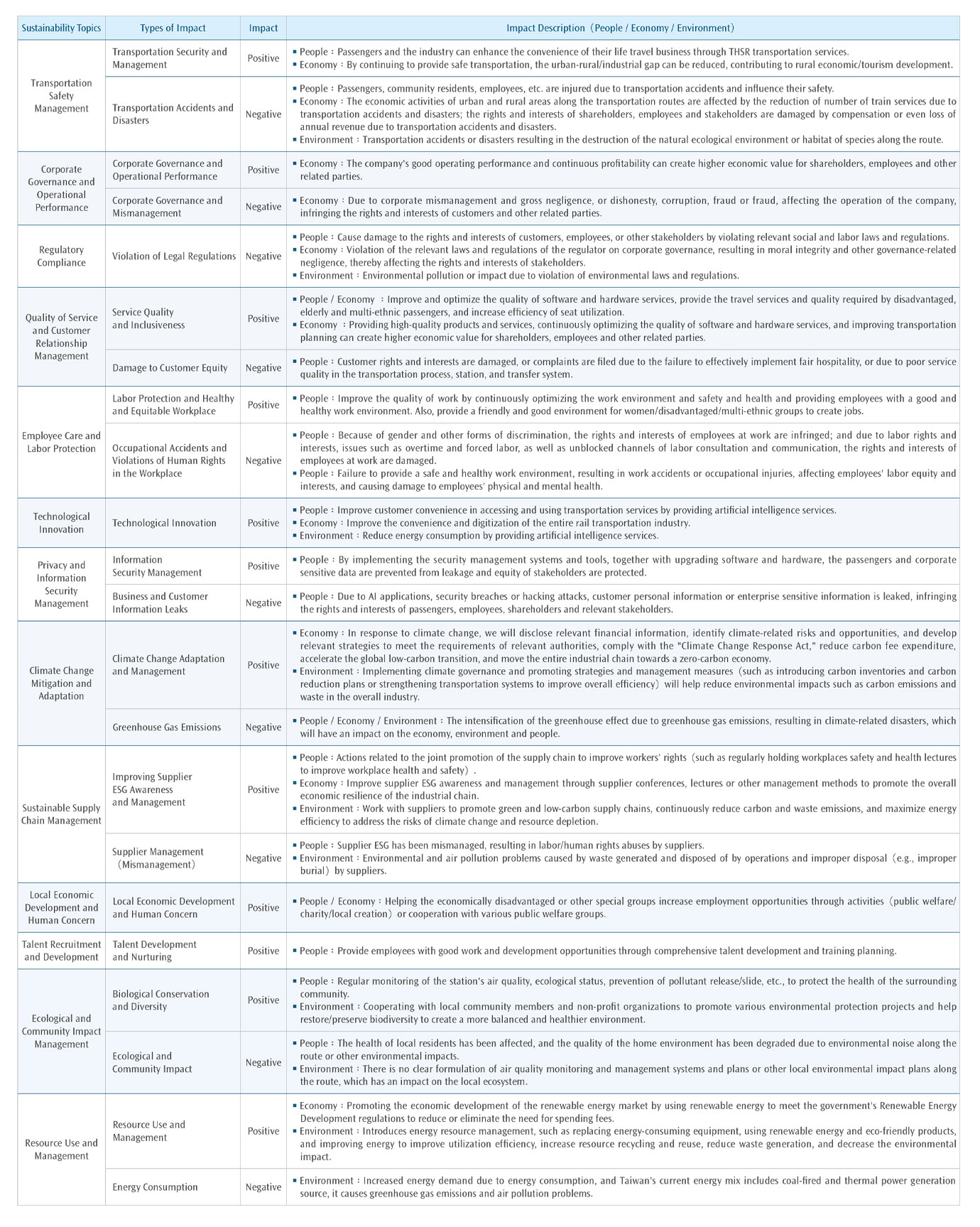 | Evaluate the definition of actual and potential impacts | Re-examine and identify the substance and potential positive and negative impacts of 13 sustainability topics. After re-examination in 2024, the list of 13 topics were re-defined into 12 positive and 10 negative ones and total 22 positive and negative impacts were separately identified. After comprehensive consideration of regulatory trends and industry dynamics, the following adjustments are made: 1. Privacy and Information Security Management ・Negative impact – business and customer information leaks: The increased risk of customer privacy and personal information leakage caused by AI applications was taken into consideration, so the impact description is adjusted to " Due to AI applications, security breaches or hacking attacks, customer personal information or enterprise sensitive information is leaked, infringing the rights and interests of passengers, employees, shareholders and relevant stakeholders." 2. Resource Use and Management ・Positive impact – Resource use and management: Incorporate the concept of recycle and reuse, the impact description has been modified to “Introduces energy resource management, such as replacing energy-consuming equipment, using renewable energy and eco-friendly products, and improving energy to improve utilization efficiency, increase resource recycling and reuse, reduce waste generation, and decrease the environmental impact.” |