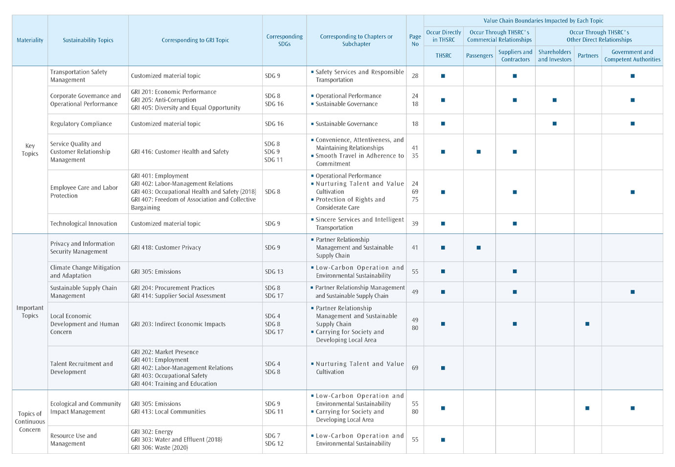 In 2024, THSRC reviewed domestic and international sustainability regulation, ratings, and sustainability topics of benchmark companies to identify the sustainability topics and positive and negative impact issues defined in the previous year and appropriately adjusted the name and impact descriptions of sustainability topics. In addition, the degree of impact and likelihood of occurrence of impacts are adjusted with reference to the due diligence results, and the sustainability topics ranking and materiality matrix of 2024 sustainability report are comprehensively adjusted and completed. Through assess the significance, substantive of the positive and negative impacts of material sustainability topics in terms of economy, environment and human rights, so as to confirm the scope of the report's disclosure and review the effectiveness of sustainable business, and respond to the needs of multiple stakeholders. At the same time, the results of the materiality identification of sustainability topics will be disclosed to the public after being submitted to the Sustainable Development & Nominating Committee and the Board of Directors.