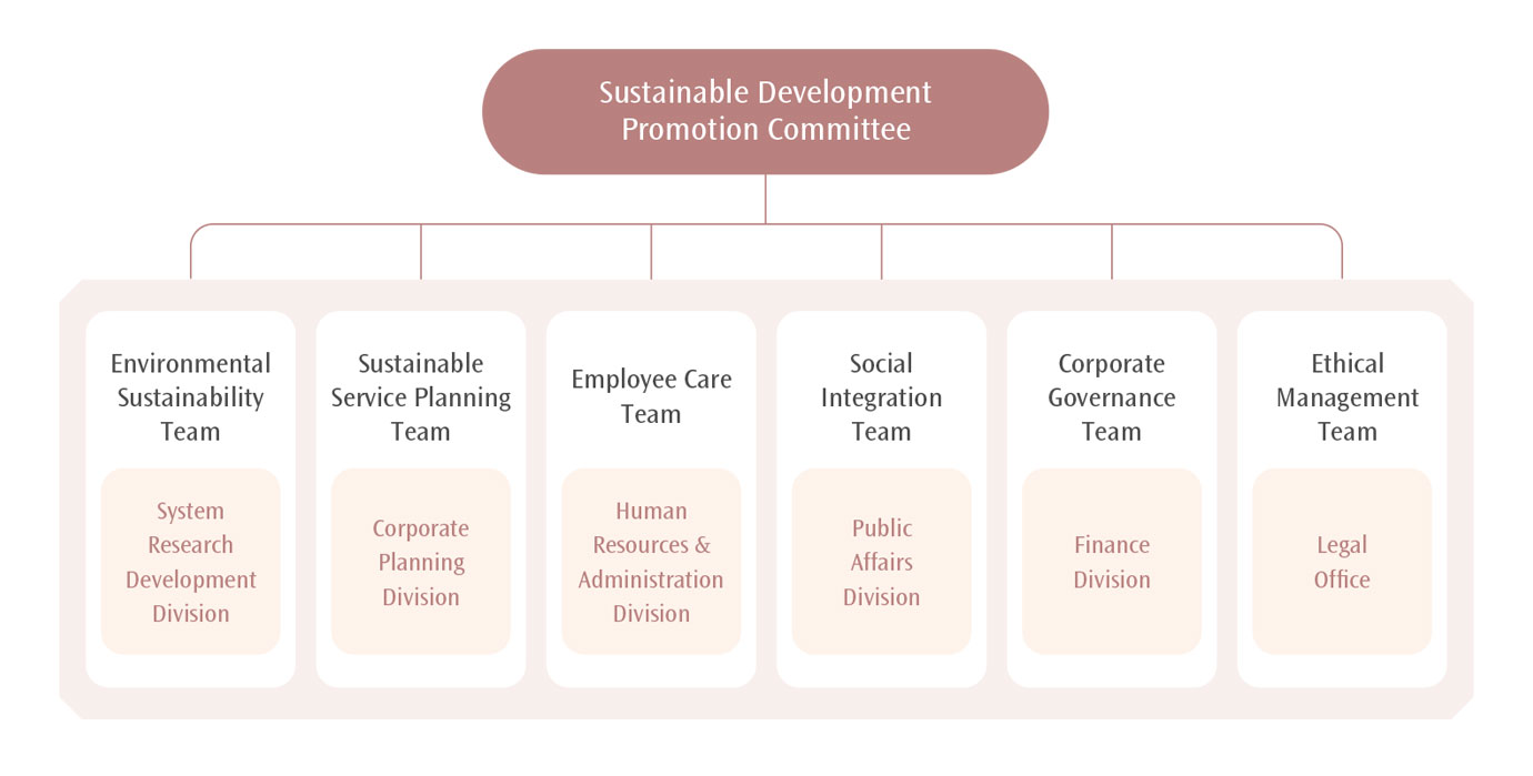 THSRC has established the “Sustainable Development Promotion Committee” under the “Sustainable Development & Nominating Committee” of the Board. The Sustainable Development Promotion Committee is overseen by the Board and the Chairman, and is composed of the President and senior executives from managerial departments. The Sustainable Development Promotion Committee's six sustainability teams continue to focus on internal corporate issues related to sustainable management, and reports implementations and achievements to the Sustainable Development & Nominating Committee and the Board every year. Climate-related governance, strategies, responses, and promotions are coordinated by the Environmental Sustainability Team through jointly formulated strategies, targets, and action plans associated with climate change, nature, and net zero issues.