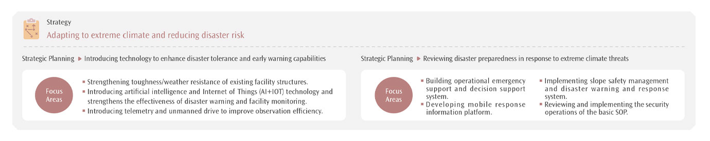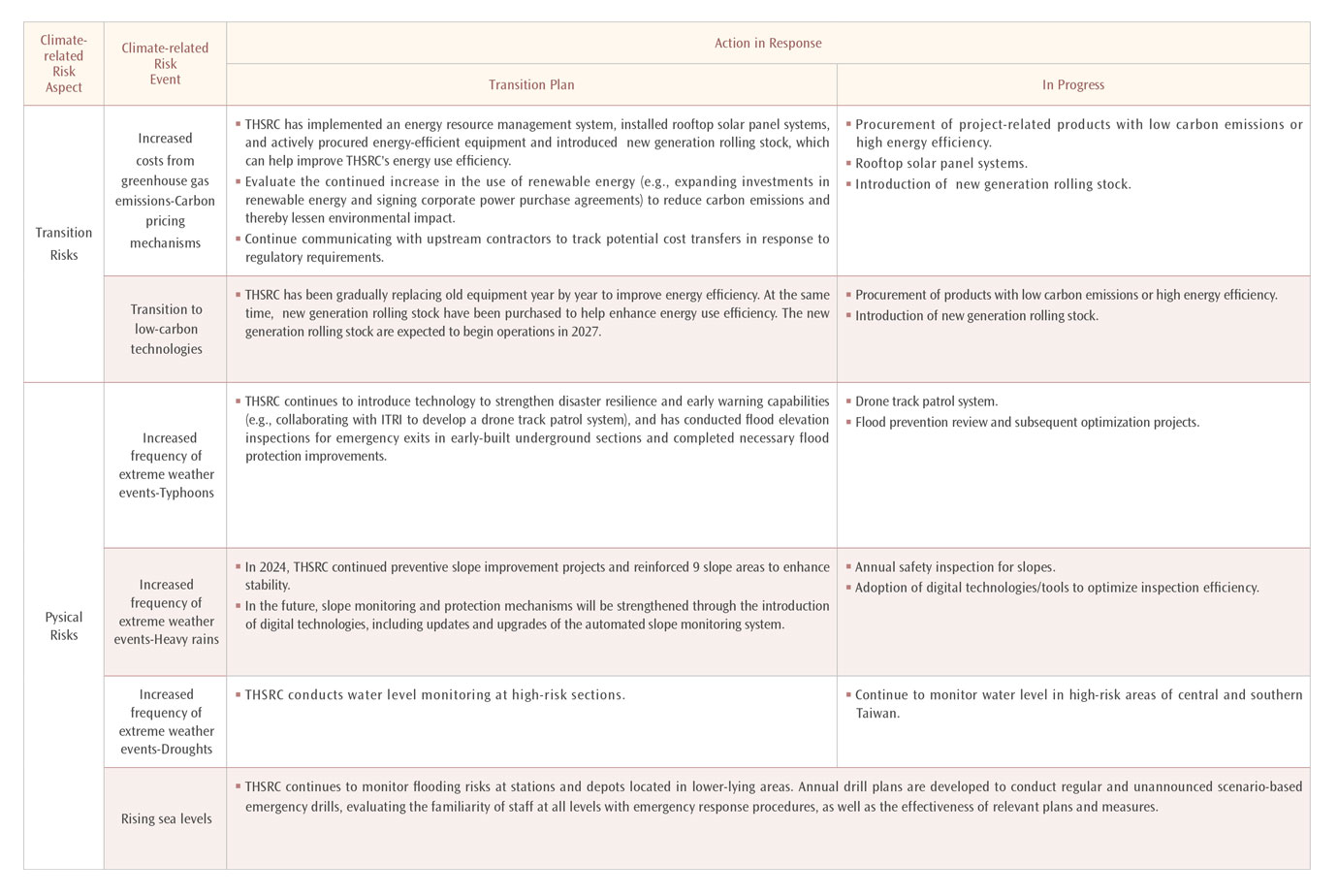 Based on the results of the climate risk assessment mentioned before, THSRC has established the guidelines for adverse weather operations, and implemented corresponding actions based on physical risks. Currently, the Company has already developed a sound early warning mechanism for climate-related disasters and will further enhance the disaster tolerance of track-related infrastructure and the climate resilience of operating system. This will ensure the provision of safe and secure services, allowing passengers to travel safely.