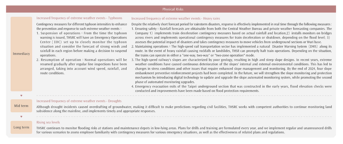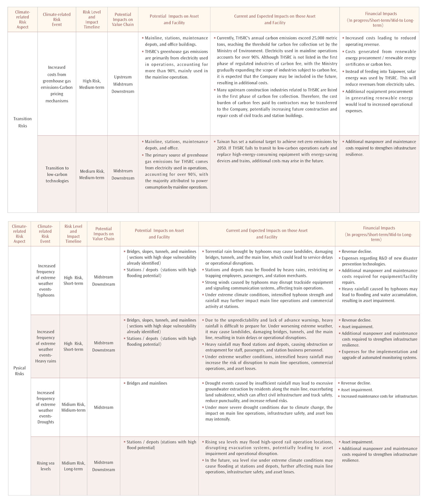 THSRC conducted a comprehensive assessment of climate change risks and opportunities referring to the TCFD disclosure framework. At the same time, the Company continues to introduce scenario analysis and financial quantification of risks, and the results will be disclosed in subsequent reports. The latest climate risk assessment was completed by the Company at the end of the 2024. Taking into account the unique characteristics of the railway transport industry and prioritizing internal natural disaster management practices, the assessment identified 3 moderate risks and 3 high risks from 12 climate-related risks, including 2 transition risks and 4 physical risks. A timeline of potential impacts of climate risks is also incorporated into the transformation plan. The periods of impact are classified as short-term (2024–2026), medium-term (2027–2035), and long-term (2035–2050). The response actions and related financial descriptions for managing climate risks will be disclosed in subsequent reports. Please refer to the table below for the results of this evaluation.